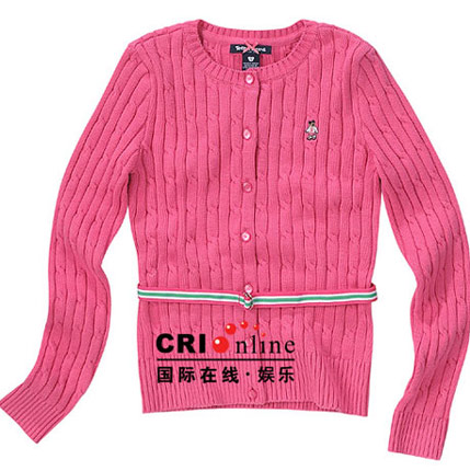 粉色圆领毛衣,腰间的条纹腰带起到很好的收腰作用,粉嫩可爱。