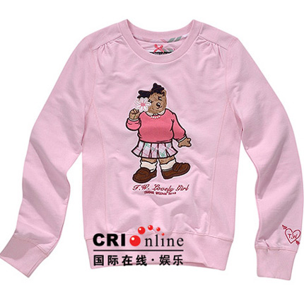 淡粉色上衣,质地舒适,胸前小熊图案活泼可爱,适合温柔活泼下女孩。