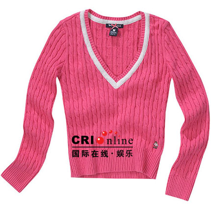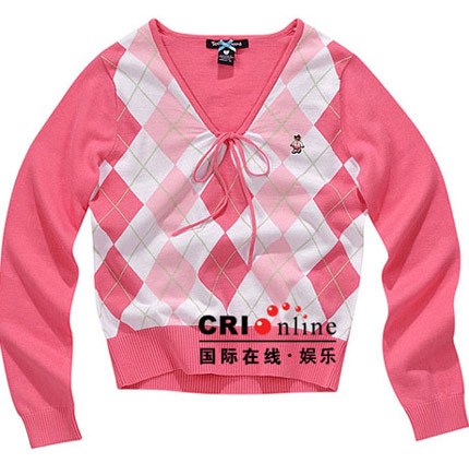 粉白相间的菱形V领毛衣,领口有小蝴蝶结装饰清新可人,带有一丝书卷气。