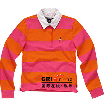 桔色与粉色相间的宽条纹T恤,颜色亮眼宽横条的设计不但不会使身材显胖,还会展现活泼动感的青春朝气。