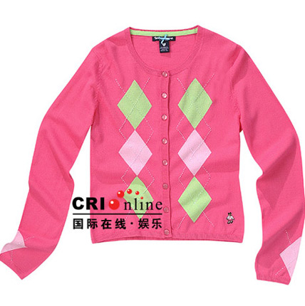 粉色针织衫胸前菱形装饰图案,适合温柔文静的小女生,甜美可爱。