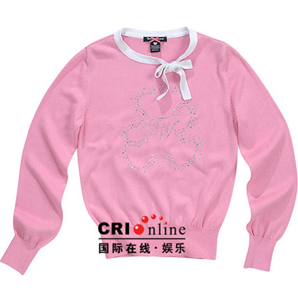 淡粉色上衣白色领边有小蝴蝶结装饰,胸前水钻镶嵌的造型精致,使服装显得精美小巧,适合身材娇小的可爱女孩。