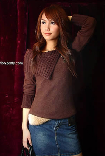 咖啡色针织衫搭配牛仔短裙,领子的设计个性时尚,展现一些忧郁浪漫的气质。