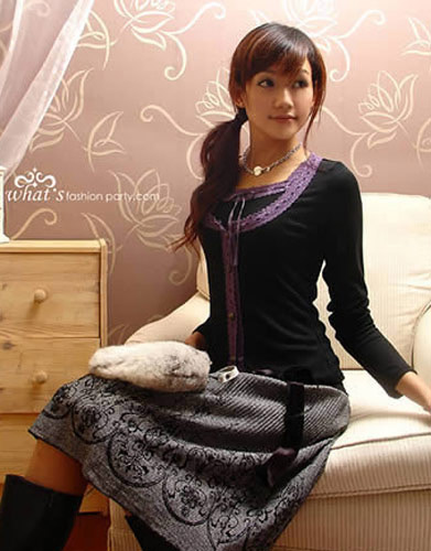紫色上衣搭配灰色小泡泡裙,颈部系上一条紫色丝巾展现女性的妩媚优雅,细节的装饰使原本古板的职业装多了些个性的时尚。