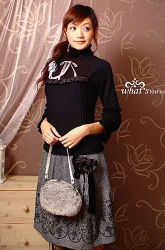 黑色高领毛衣搭配灰色A字短裙,领口的小蝴蝶结设计和裙摆的印花图案都是今年春天最流行时尚的元素,会大大提高你的时尚指数。