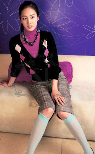 黑色菱形装饰图案的针织衫搭配格子五分裤与中长款袜子,略有些英伦风格的气息。