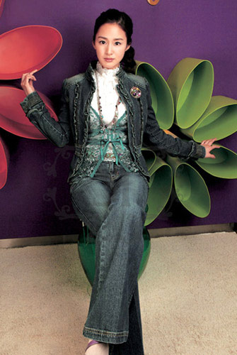 花色西服搭配牛仔长裤,展现青春的亮丽,动感时尚。