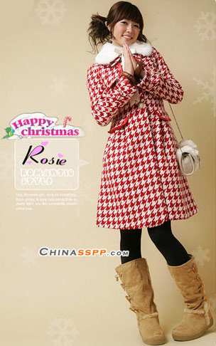 红色大衣俏皮可爱,与白色毛领搭配丰润而有节奏感