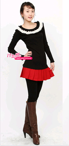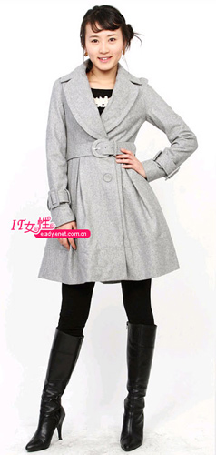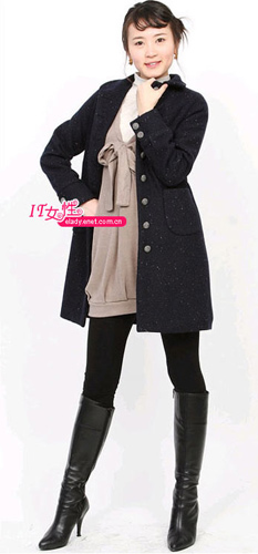 黑色大衣与短裙的搭配俏皮可爱,合腿长靴让时尚感觉升级。