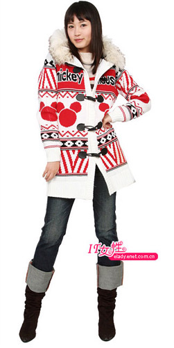 MICKEY图案的大衣可爱至极,与紧身裤搭配,不会可爱得过头又有时尚感觉。
