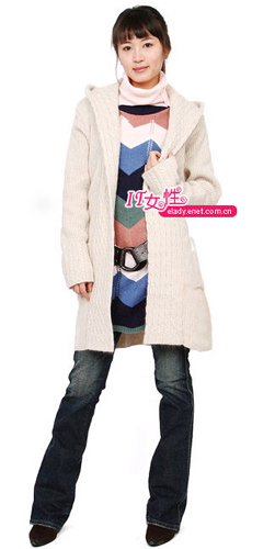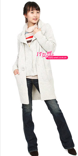 针织大衣温柔可爱,大腿磨白的牛仔裤可以让腿型更加修长。