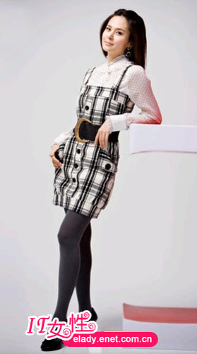 格纹长衬衣与黑色收腰裙的结合,黑色丝带增加可爱感觉