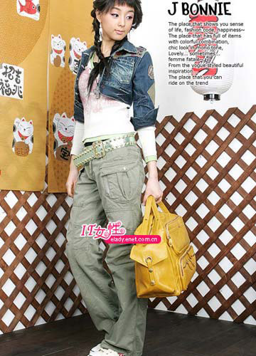 灰绿长裤与牛仔装搭配清新个性,自然最能赢得男生的好感。