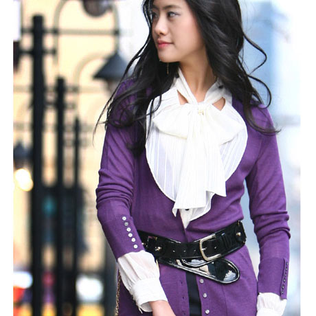 紫色的针织外套有足够的时尚理由,蝴蝶结的装饰感非常强烈