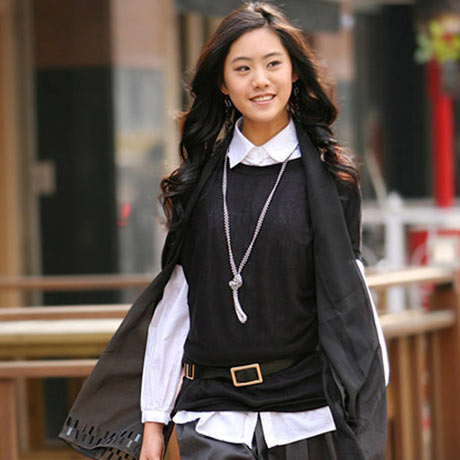 针织的坎肩随意舒适,精致的配饰打造出时尚气息