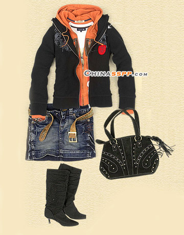 橘色橘色帽兜休闲上衣,墨绿色针织长开衫,蓝色牛仔裙,非常动感。