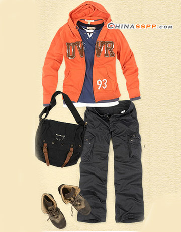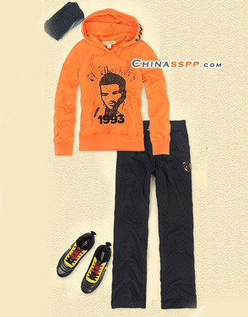 简单的橘色帽兜运动上衣,同样简单的黑色运动裤,动感十足的运动装扮。