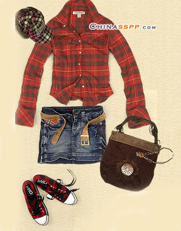 红色格纹衬衫,蓝色牛仔裙,红格休闲运动鞋,首尾呼应,连帽子都很出味。