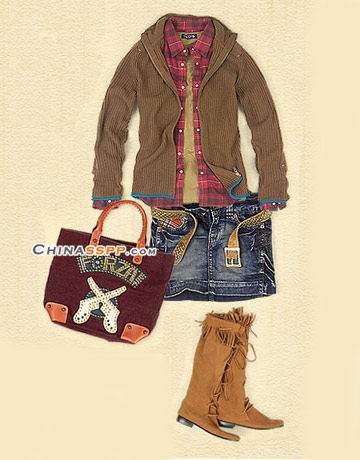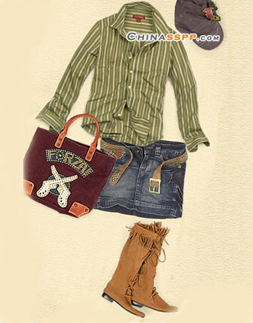 草绿色针织衬衫,牛仔裙,土黄色长靴再加一顶太阳帽,清新的邻家女孩。