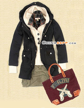 橘色帽兜休闲上衣外套黑色运动服,黑色长靴,连手袋都是黑色的,酷劲十足。