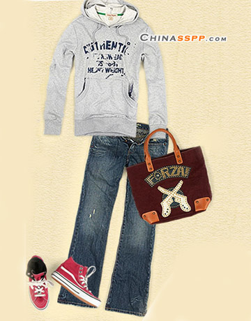 灰色帽兜运动上衣搭配牛仔裤,休闲鞋,典型的学生气质。