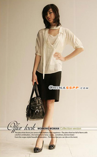 长款的侧襟上衣有些保守,但与及膝一步裙搭配上下对比,长短有致。