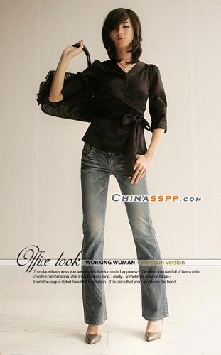 牛仔裤也能够穿出知性味道,侧面系成一个蝴蝶结流露浓浓女人味。