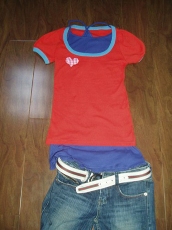 配以心型小T-shirt,俏皮可爱的风格,红色亦是热情的象征,热情的年轻活力总是能和时尚联系在一起。