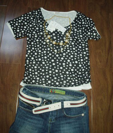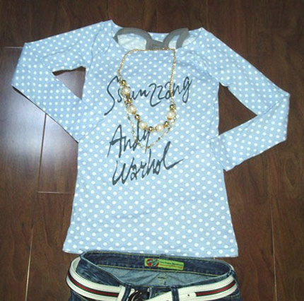 蓝色是今年的流行色之一,蓝色白点图案的可爱造型上衣,加上随意的文字logo,显得可爱富有趣味,项链和里面的小背心比较有女人气息。