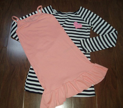 黑白条纹长袖针织衫,吊带的长群非常女人,心型的小图案实在是太可爱了。里长外短的搭配更能体现DIY喔。