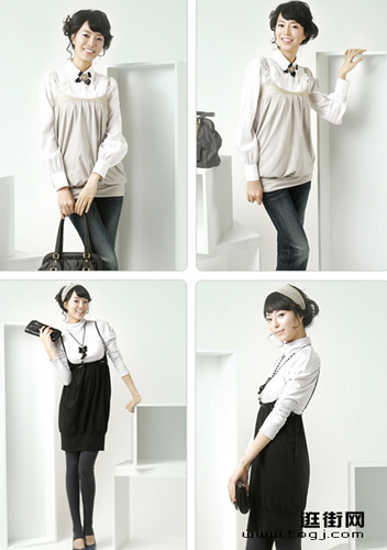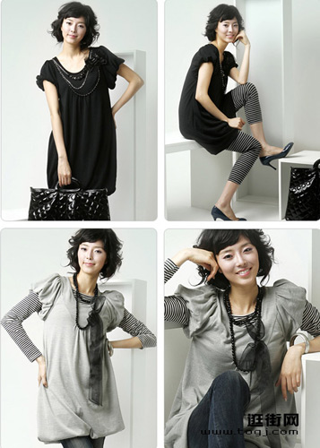 一紧一松的搭配,很有节奏。上衣的宽松黑色裙,下面搭配紧身的条纹七分裤,加上黑色的手袋和鞋子,十分有性格,亦都十分女人。而下图的黑色条纹衫与银灰色裙的里长外短搭配有另外一种感觉,显得俏皮可爱了许多。
