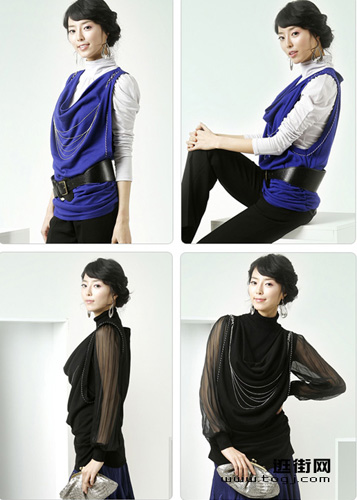 这组搭配显得很高贵。简单的长袖高领衫经过深蓝色的低胸搭肩的搭配,显得性感十足。同时腰带的造型将腰显得更纤细。下图黑色的搭配若隐若现的手臂十分吸引人,高领衫也可以保持温度,风度和温度都兼顾,两全其美。