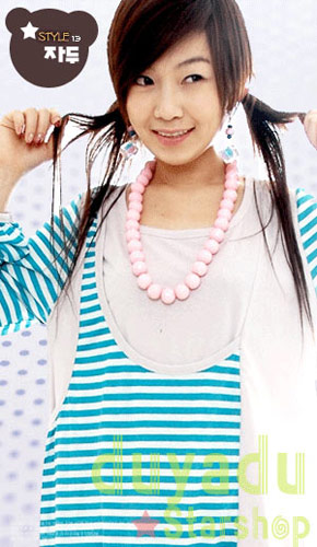 蓝色的条纹经过处理分割成了多种形式。给人感觉十分的活泼可爱,大圆珠式的项链正好搭配上衣的深领。