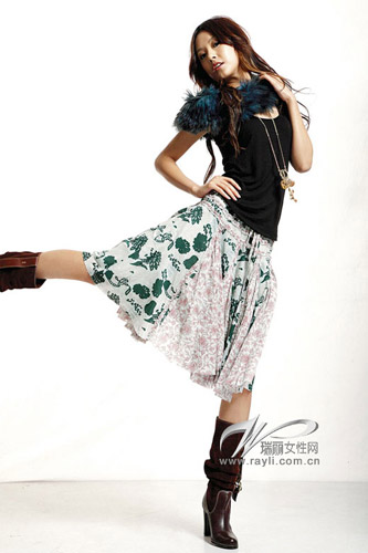 古典印花的中裙提升淑女气质,简单的缝褶勾勒完美的曲线。