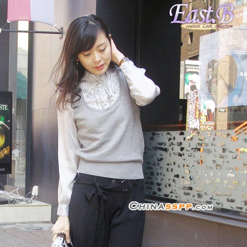 针织背心+白衬衫经典的淑女搭配,因为精细的花边而显示出与众不同。