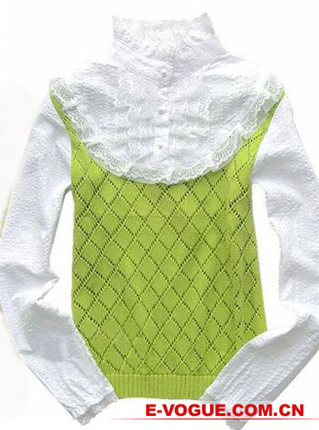 复古的蕾丝衬衣显得很清纯和干净利落,黄绿色的针织衫和清纯的感觉很搭配,整体感十分年轻纯真。