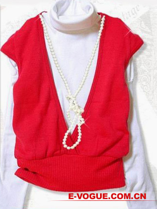 粉色的大V领能很好的展现胸部的丰满,而白色的珍珠正是填补中间的一大空白。