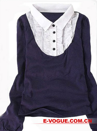 非常OL的一件小衫。蓝紫色的长袖和复古式的衬衣结合,感觉素雅。