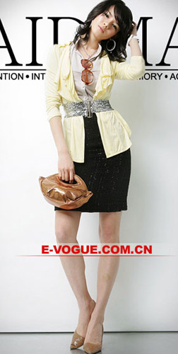 淡黄色的外衫犹如阳光一样的颜色,清新又不刺眼,灰色的衬衣和黑色的裙子对比强烈,而腰带的位置显得高挑和苗条。