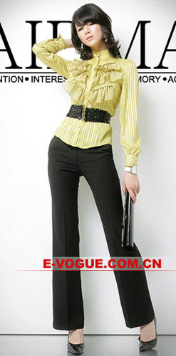 黄色条纹复古衬衣,将气质带回了中世纪,黑色的腰带和裤子颜色很搭配,而且将腰和臀更突出了好曲线。