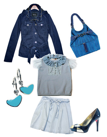 适用场合:温暖的天气时更加适合冷色调的蓝,像一丝清风带给人清凉。蓝色既能适用于正式的办公室,又能够表现出少女般的浪漫。逛街或上学都可以选择一身蓝色装扮。