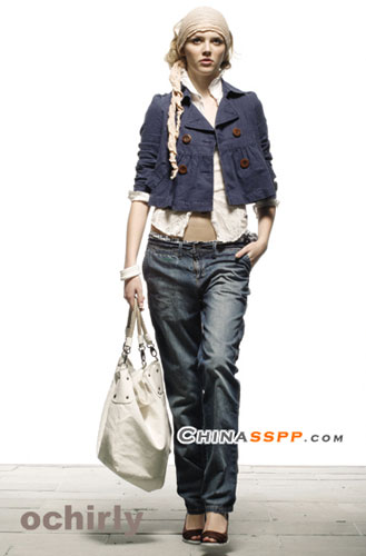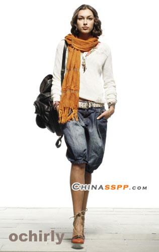 泡泡型设计的加入让牛仔裤增添了甜美、活泼的元素,松松垮垮的裤子配上同色系的腰带配合与腰带同色系的合体针织服装,简洁而活泼。