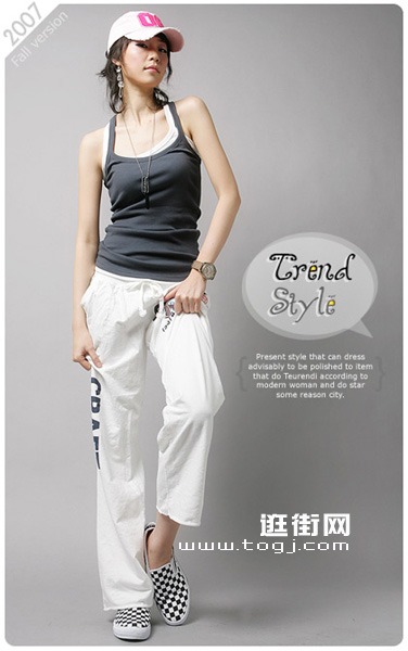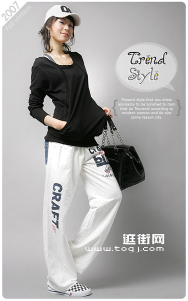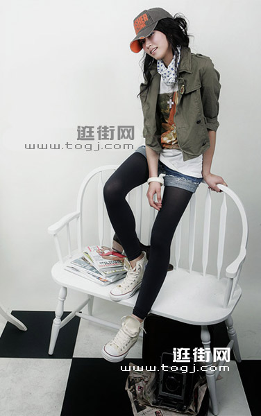 黑白两色造就MM这款帅气装,棒球帽与裤裤交相呼应。