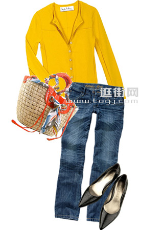 普通的开襟上衣和牛仔裤简单易搭,乡村感的草编包增加田园气息,为你带来新鲜感。