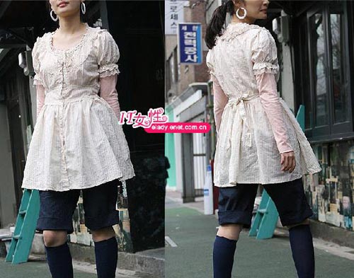 颈部和袖子都设有漂亮的蕾丝,柔和的线条看起来非常漂亮,腰部的线条是向两端伸张的,因此可以充分岩石自己对身材的不自信,再配上长短到膝盖的短裤,看起来非常可爱哦!