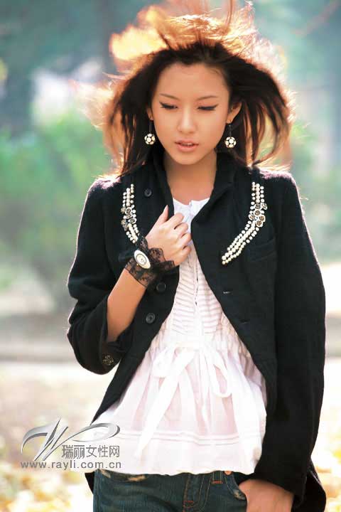 蝴蝶结和褶皱使原本普通的白衬衫充满了公主气息,黑色的外套中和了衬衫的可爱,蕾丝带手表增加性感度。