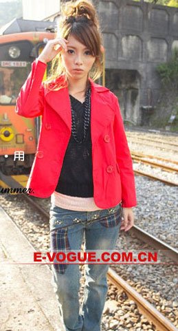 大红色双排扣小西服与黑色搭配才最正点,配上紧腿仔裤怎么看都很酷。