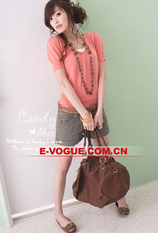 T恤搭卷边短裤简洁又可爱,略带夸张感的木制首饰增添更多韵味与内涵。