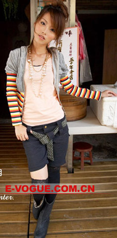 长短T恤混搭,层次感很强,风格迥异却非常甜美,艳丽的条纹衫让活力飞扬。