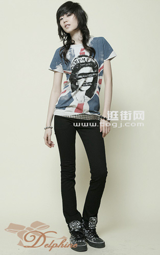 朋克味道的T恤+银色腰带酷味十足,搭配黑色帆布鞋中性感觉正流行。